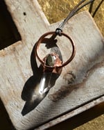This pendant features a faceted picture jasper stone and natural quartz point set in a copper halo. It is suspended from an adjustable leather cord.