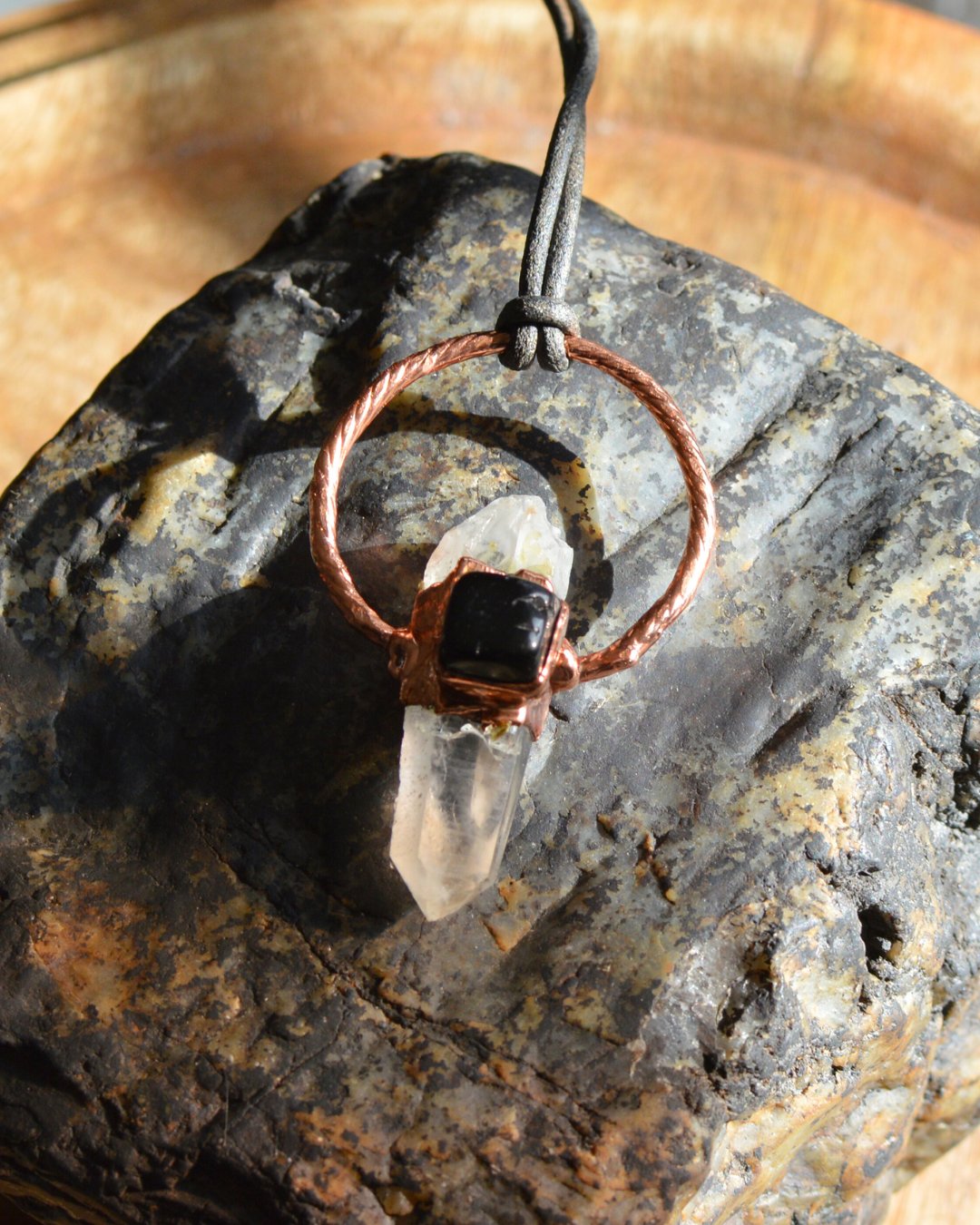 This pendant features a square obsidian stone and natural quartz point set in a copper halo. It is suspended from an adjustable leather cord.