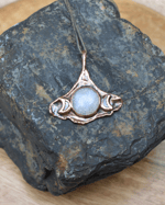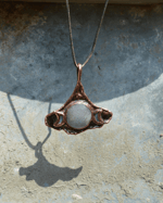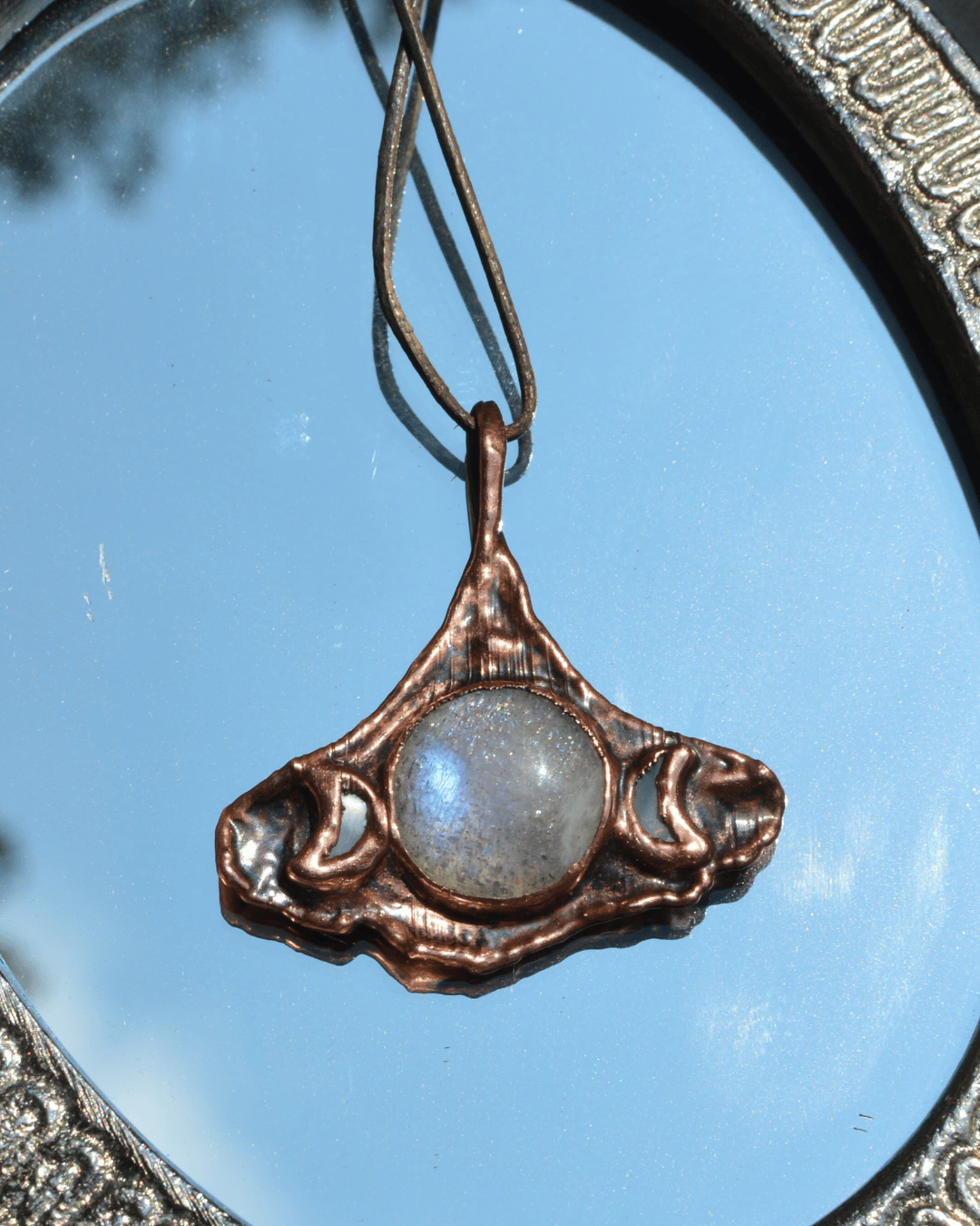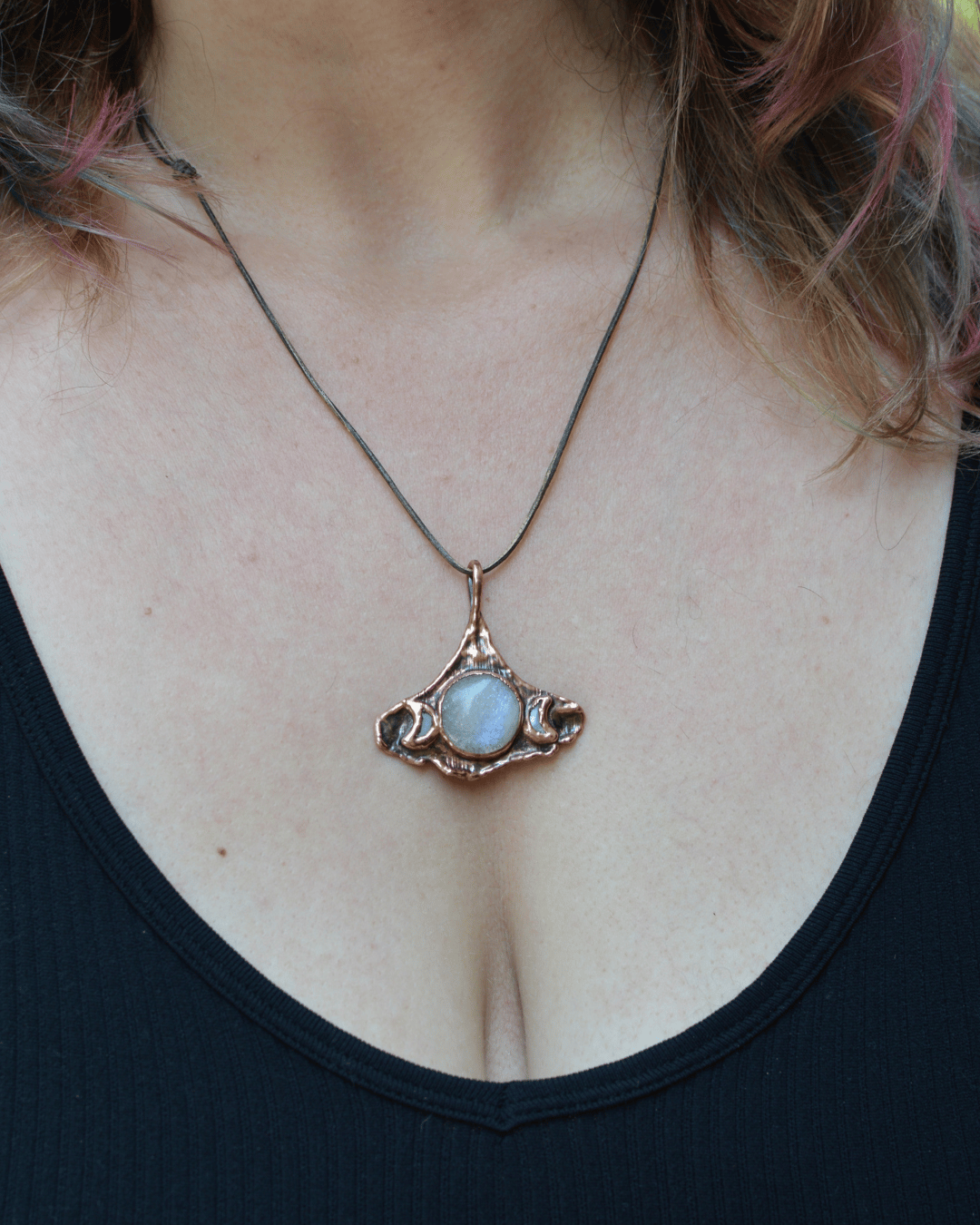 This pendant features a circular moonstone and mother of pearl crescents set on a copper-plated gingko leaf. It is suspended from an adjustable leather cord.